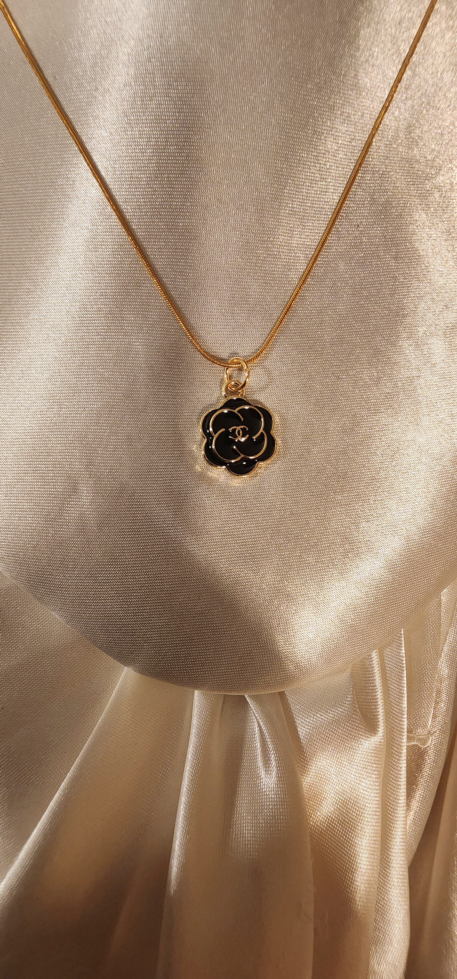 Part of our CC Era Collection. This Camellia flower charm necklace is crafted using an authentic vintage designer component, originally sourced from a designer accessory. The charm component has been thoughtfully repurposed, restored and reworked into a timeless pendant. Our necklaces are made with solid Sterling Silver 925 and thick gold vermeil—fine-jewelry grade, made with real precious metals and designed to last a lifetime.