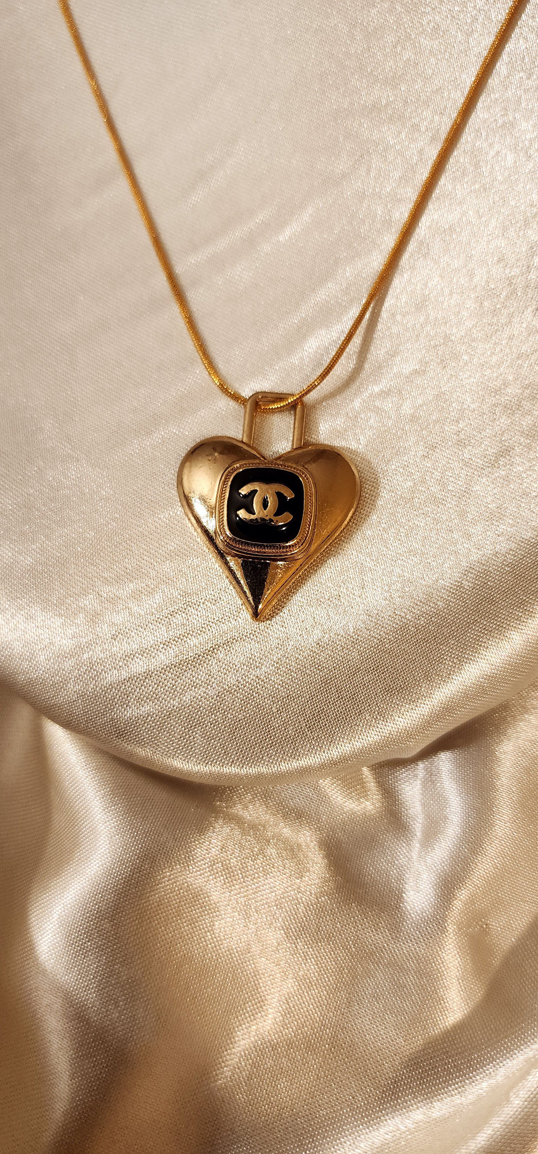 Part of our CC Era Collection. This black and gold button heart charm necklace is crafted using an authentic vintage designer component, originally sourced from a designer garmet. The charm component has been thoughtfully repurposed, restored and reworked into a timeless pendant. Our necklaces are made with solid Sterling Silver 925 and thick gold vermeil—fine-jewelry grade, made with real precious metals and designed to last a lifetime.